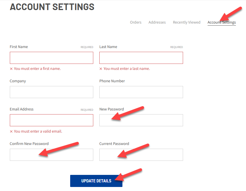 On the account settings screen enter your new password in the “New Password” and “Confirm New Password” fields. Next, enter your old password in the “Current Password” field and click on “Update Details”